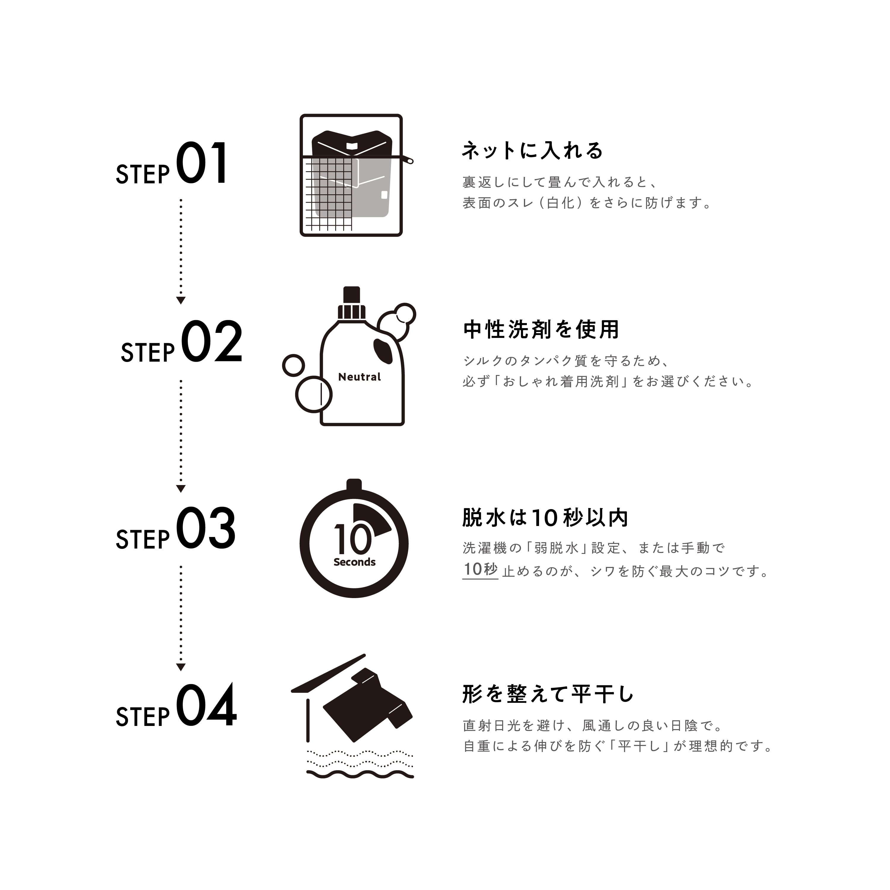 A. 一般的なシルクより織り密度を高く設計しているため、洗濯後の型崩れを大幅に抑制しています。脱水後に軽く形を整えて「平干し」するだけで、シルク本来の美しいシルエットが戻ります。